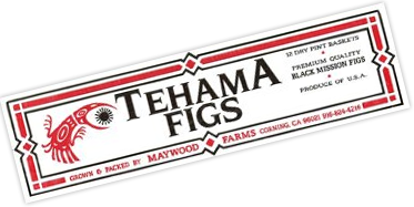 Tehama: The bird represents a crow flying away with a ripe fig in its mouth. Maywood Farms is located in Tehama County. There are many stories about where the name originated. Our favorite is that Tehama was the local Indians word for salmon.